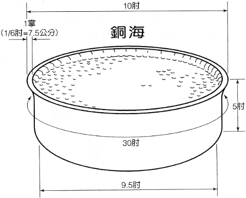 23. 其大小为直径5公尺,高2.5公尺,厚一掌(26节,1/6肘=7.5公分)。其容量约为一万加仑(二千罢特为一种度量衡,参:被掳后的“三千”,代下四5)213。后人重绘其形状为圆周约三十肘(π=3.1416)214。
