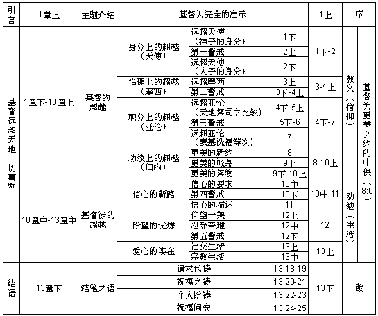 1章 基督超越先知与天使 2章 基督为人的目的 3章 超越摩西 4章 超越约书亚 5章 基督乃永远的祭司 6章 当竭力进到完全的地步 7章 麦基洗德的等次 |