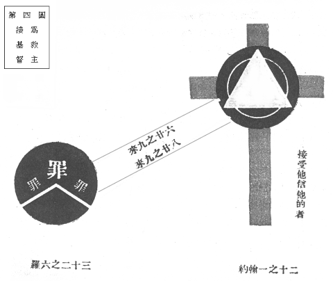 各位你能领会主在十架担当我们罪恶的要道么?这图的红色十字是架,表明主的血,他要做人的救主,就要死在十字架上。可惜今日有许多人只承认基督是一个完人的模范,光接纳他的人格,但不接他为救主。这样我可老实对你说,无一人能由基督的人格得救的。基督救人,不是用人格,是替死,是流宝血,因为独有血才能赦罪,我们若不接纳基督为救主,就无人能由属肉的地位,进到属灵去,望各与主有特别的关系,认主为救主,全心接纳他,这就由属肉体的进到属灵的第一步了。